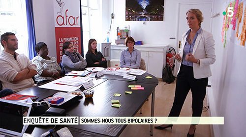 FRANCE 5 – 7 février 2018 Enquête de Santé – "Sommes-nous tous bipolaires ?" Documentaire réalisé par Cécile Tartakovsky pour l'émission Enquête de Santé dont une partie a été filmée lors d’une formation menée par Alice Vignaud, pair aidante, en octobre 2017 à l’Afar.